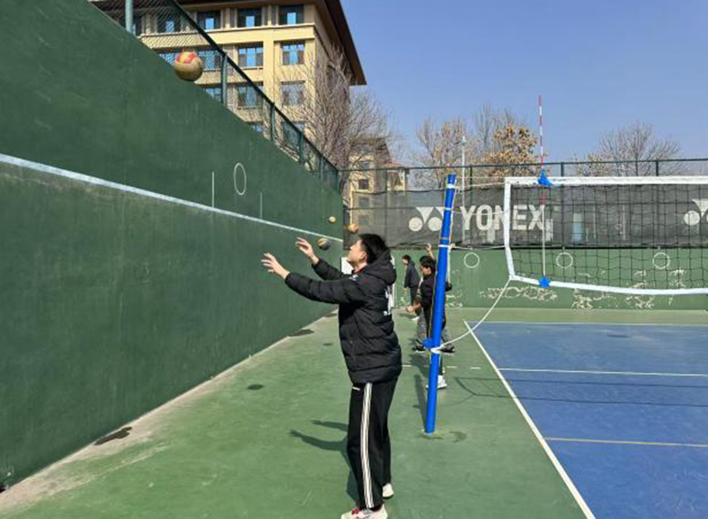 采用“1+2”指导模式,每位主教练搭配两名助教进行多角度动作分解。主教练正面演示正手引拍时,两侧助教同步展示侧方位动作轨迹,学员可360°观察肩部转动与重心转移的协调配合。在巩固基础后,教练组架设移动式发球机,由助教在对面场地进行多球喂送,通过变换落点与球速,模拟真实比赛中的高压情境,让同学们在体育课程中学会体育、热爱体育、终身体育!