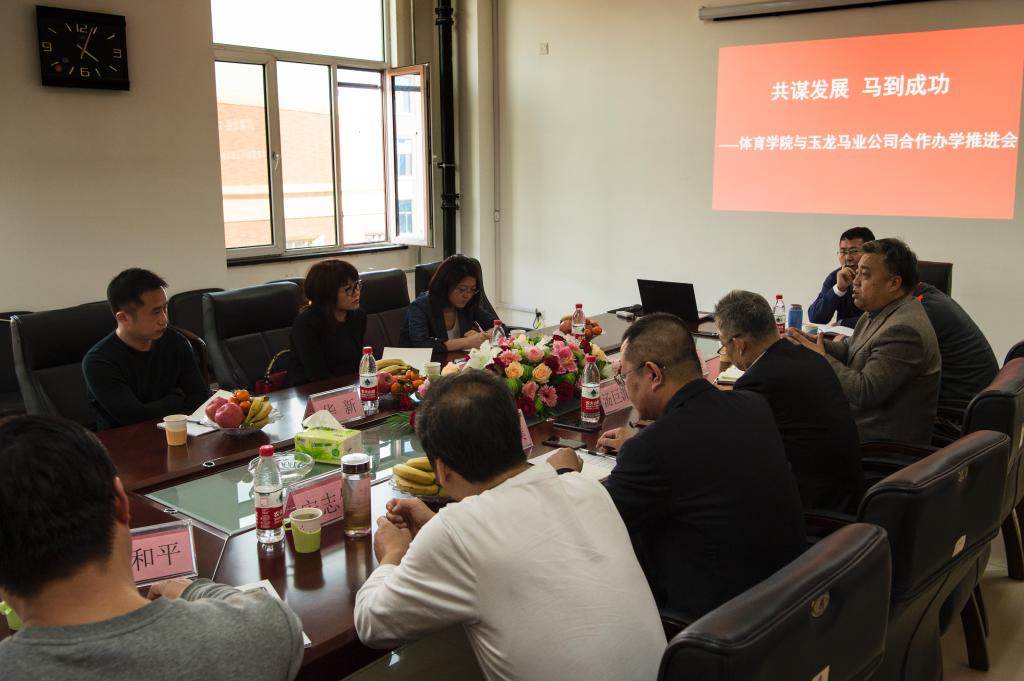 会上,史冬博经理首先介绍了与玉龙马业合作开展马术专业的想法和具体规划。并强调,与玉龙马业合办马术专业是公司今年的重要工作,希望与玉龙马业共谋发展。马静总经理代表公司就今后的合作方向,员工培养方式和专业实践等方向进行充分沟通与讨论。会后,在公司领导的陪同下,马静总经理一行参观了公司的荣誉室,并充分肯定我远在山西省高校体育领域的突出成绩。