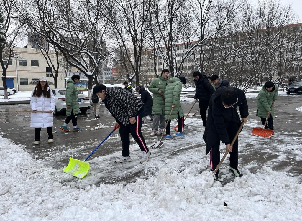 本次清扫的区域集中在虎峪校区体育馆、教学楼以及周边区域。同学们自带工具,迅速开始扫雪工作,用手中的铁锹、扫帚和铲子,一点一点地清除路面上的积雪。凌冽的寒风中,同学们干得热火朝天,刺骨的低温丝毫没有影响同学们的热情,大家齐心协力、分工有序,有的负责把坚硬的冰块敲碎,有的负责把碎冰块铲走,还有的拿着扫帚清扫残余的雪块。飞舞的雪花和干劲十足的同学们共同构成了一道靓丽的风景线。经过一个上午的奋斗,主干道交叉路口的积雪基本被清理干净,确保了校园道路的正常通行,为师生们开辟了一条安全之路。