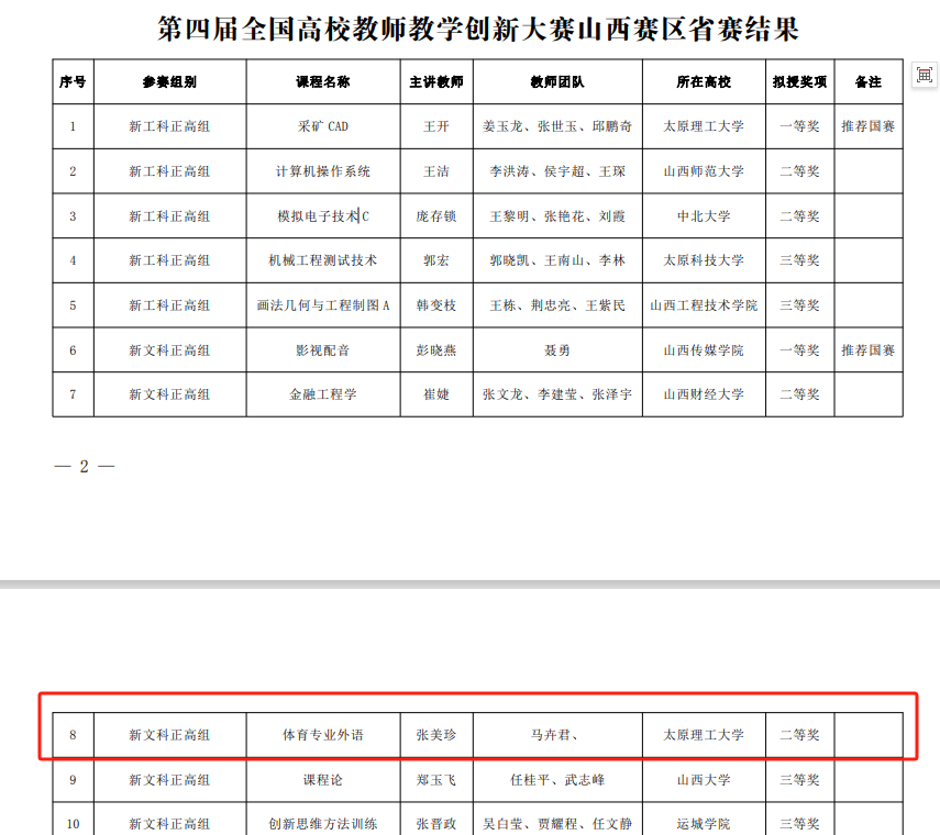 依据《山西省教育厅关于公布第四届全国高校教师教学创新大赛山西赛区获奖名单的通知》公司教授张美珍老师的《体育专业外语》获得新文科正高组全国高校教师教学创新大赛二等奖。