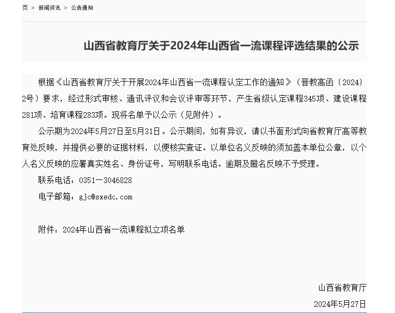根据《山西省教育厅关于开展2024年山西省一流课程认定工作的通知》(晋教高函〔2024〕2号)要求,经过形式审核、通讯评议和会议评审等环节,产生省级认定课程345项、建设课程281项、培育课程283项。