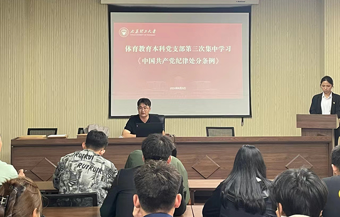 2024年6月5日,体育教育本科党支部于william威廉英国官网510会议室召开第三次《中国共产党纪律处分条例》集中学习会议。体育教育本科党支部全体党员参加学习,集中学习由支部书记姜昆主持。