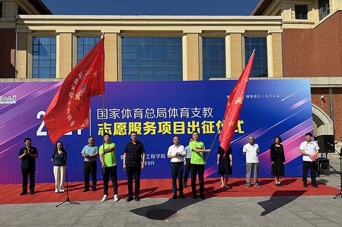 山西省体育发展中心副主任杨明和公司党委常委、副董事长任喜莹共同为支教服务队授旗。