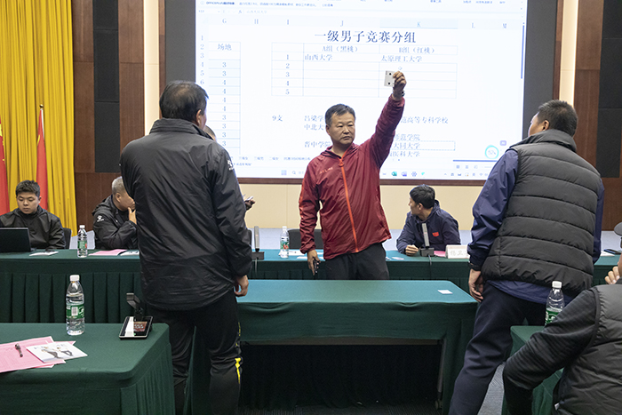 裁判长杨卫华对比赛的技术环节进行了深入探讨和安排,会议现场进行抽签,电子屏幕同步公示结果。