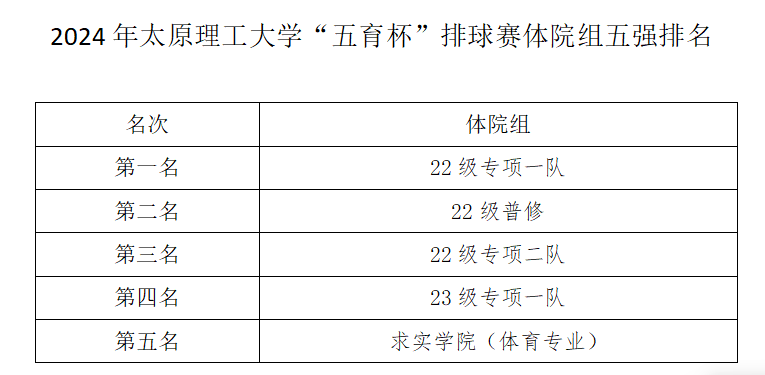 体院组前五名分别为22级专项一队、22级普修、22级专项二队、23级专项一队和求实公司(体育专业)。