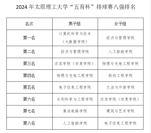 女子组前八名分别为经济与管理公司、人工智能公司、物理与光电工程公司、轻纺工程公司、文法与外语公司、求实公司(宗复公司)、建筑与艺术公司和电子信息工程公司;