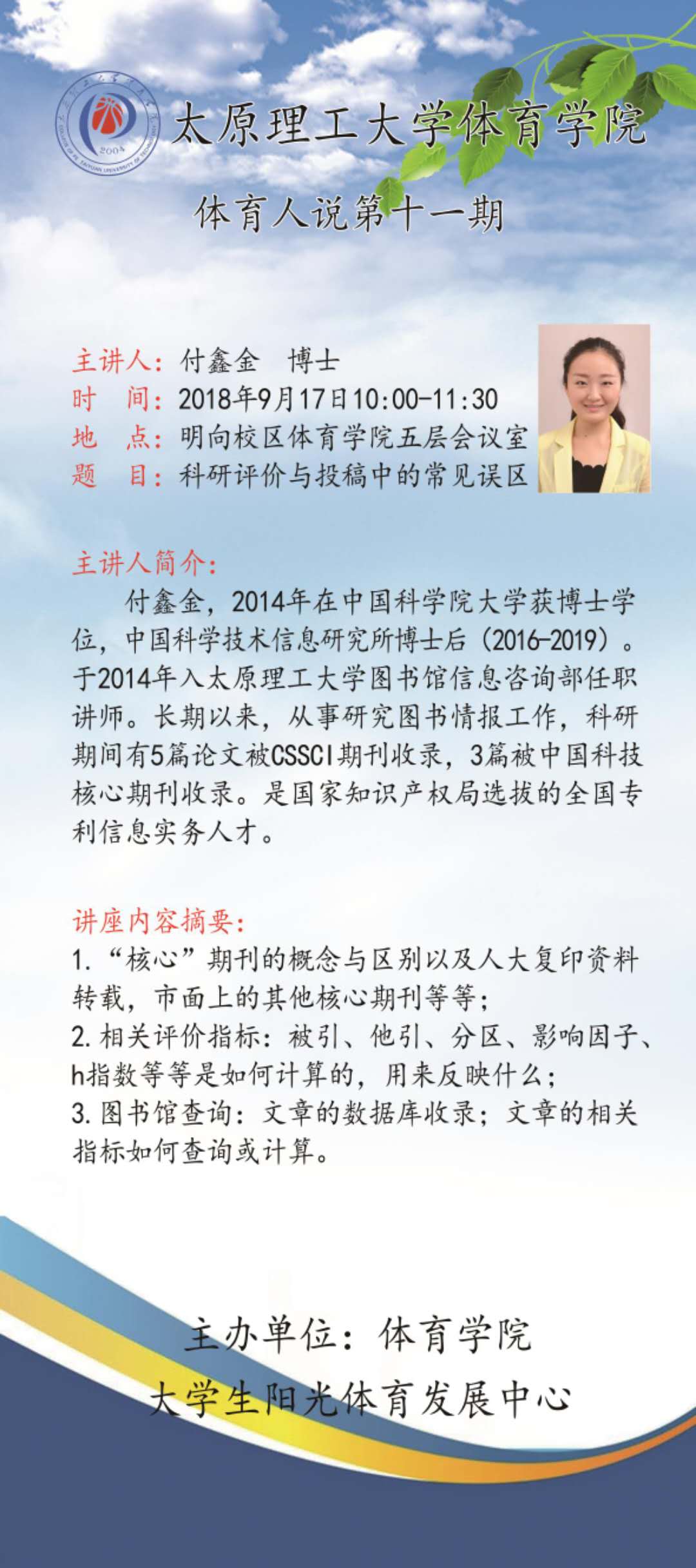 本学期william威廉英国官网《体育人说》系列讲座第十一讲《科研评价与投稿中的常见误区》于2018年9月17日(周一)上午10:00开讲,详情请见海报内容。希望各位老师准时参加!