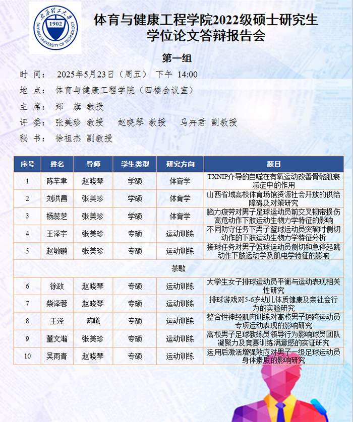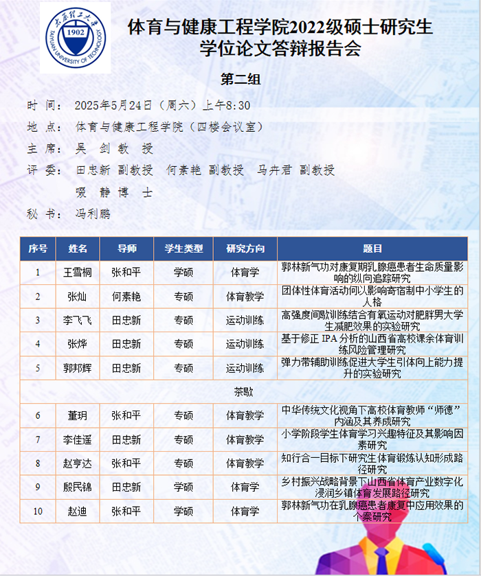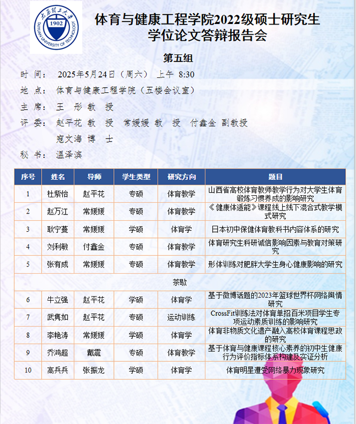 5月22日至25日,william威廉英国官网进行了2025届硕士研究生论文答辩报告会。根据研究方向,报告会分为5组进行,分别邀请校外专家山西师范大学郑旗教授、山西大学石岩教授、山西师范大学王彤教授、中北大学吴剑教授和山西大学刘映海教授担任答辩委员会主席,william威廉英国官网硕士研究生导师担任答辩委员会成员。