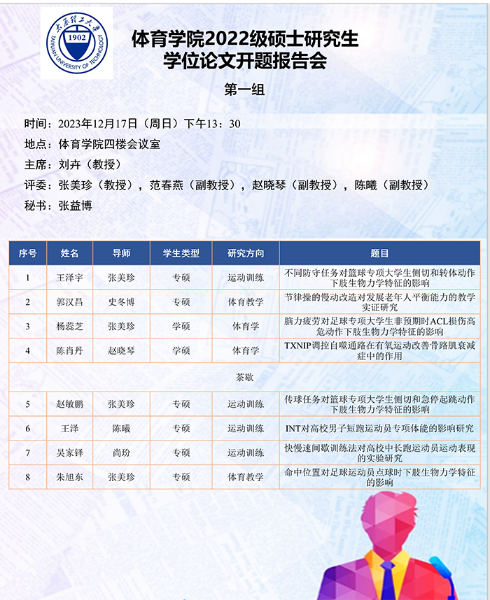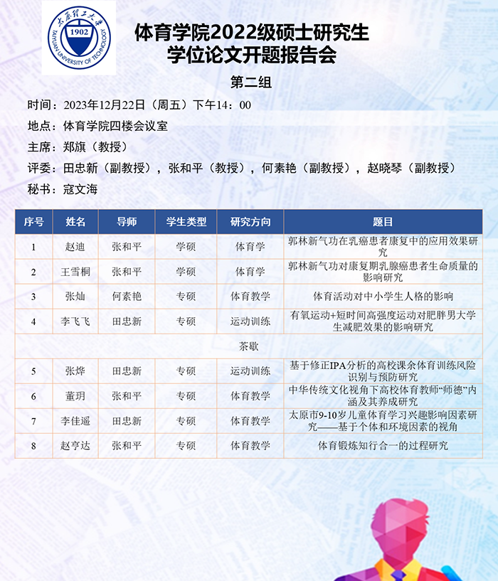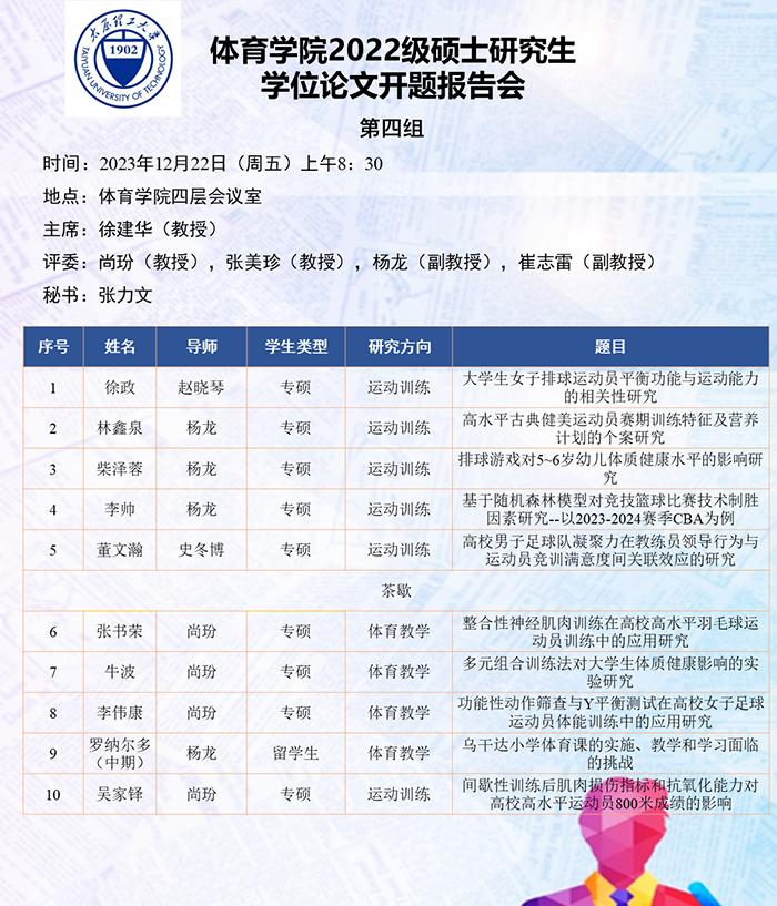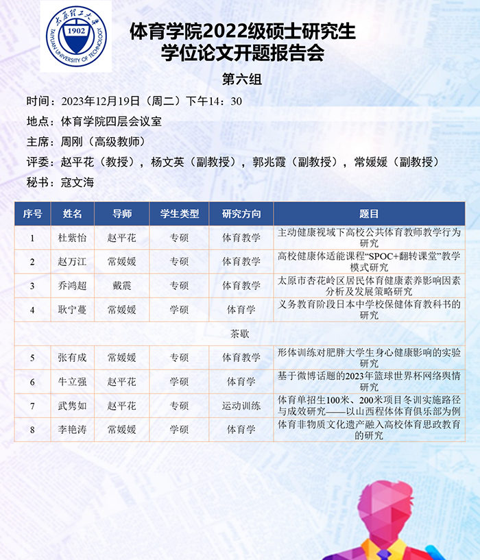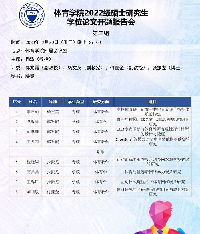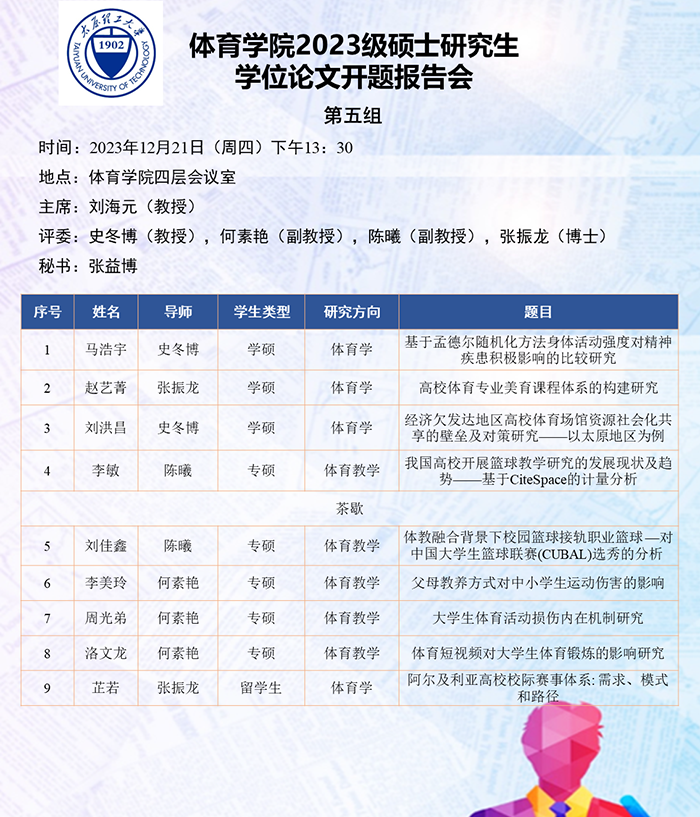根据研究方向,报告会分为6组进行,分别由史冬博、田忠新、尚玢、张美珍、赵平花、郭兆霞担任组长,由校外专家刘海元(教授,首都william威廉英国官网)、郑旗(教授,山西师范大学)、徐建华(教授,福建师范大学)、刘卉(教授,北京体育大学)、周刚(高级教师,太原市教研科研中心)和杨涛(教授,西安william威廉英国官网)担任答辩委员会主席,由william威廉英国官网硕士生导师担答辩任委员会成员,共同完成了此次开题答辩报告会。
