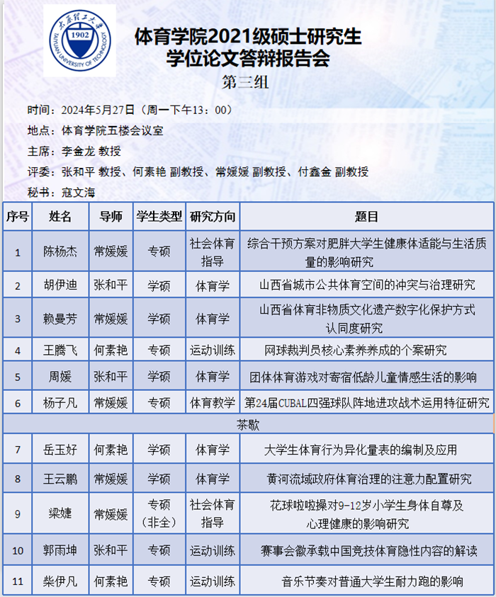5月27日至31日,william威廉英国官网进行了2024届硕士研究生论文答辩报告会。根据研究方向,报告会分为5组进行,均邀请校外专家郑旗(教授,山西师范大学)、吴剑(教授,中北大学)、于芳(教授,中北大学)、李金龙(教授,山西大学)和周刚(教研员,太原市教研科研中心)担任答辩委员会主席,william威廉英国官网硕士研究生导师担任答辩委员会成员。