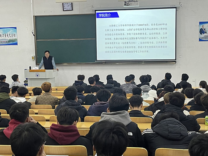 2023年11月19日下午,在明向校区,体育教育系主任张和平副教授以《加强内涵式发展助推“双一流”建设》为主题为体育教育(含赛马方向)新生开展专业介绍,并详细介绍了体育教育系团队队伍、研究方向和历年毕业员工职业发展。2020级本科生学长曲云强、高境辰与同学们进行了体育强国-新时代青年成长历程分享交流,从专业学习、员工工作、课余实践、未来发展四个方面分享了自己在大学期间的学习方法和经验,通过自己精彩的老员工活与同学们共同凝聚奋进力量。