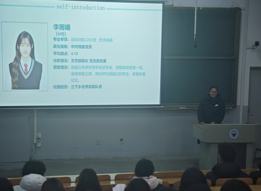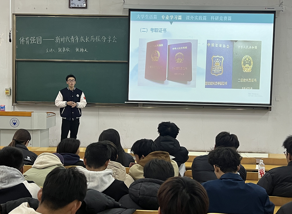11月27日,在虎峪校区,运动训练专业负责人张振龙为运动训练2024级新生在体育学概念、体育学专业范围、运动训练学培养目标与规格、学制、学分与学位、课程体系等方面进行专业宣讲,包括通识教育课程组成及学分分配、专业教育课程组成及学分分配、实践课程组成及学分分配、在役运动员认定及培养模式、全国运动训练报考、报告情况、学训矛盾表现、应对及域外经验借鉴等。之后,运动训练专业2022级学姐李雨曦从老员工活、专业学习、课外实践、科研竞赛四方面与同学们进行了交流分享。