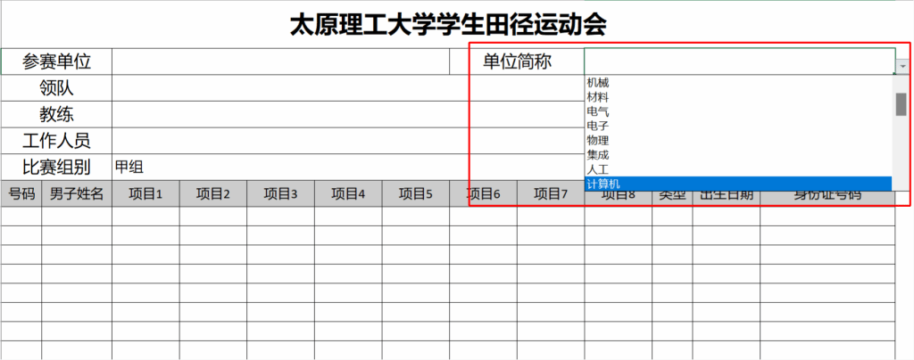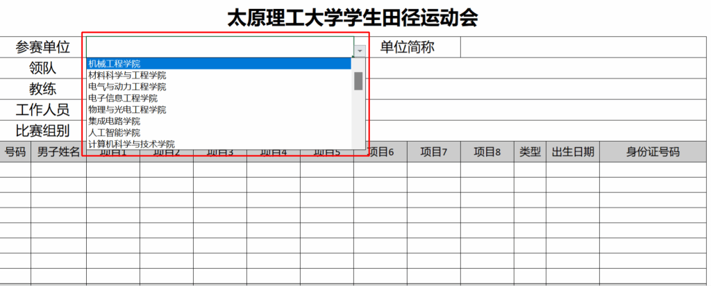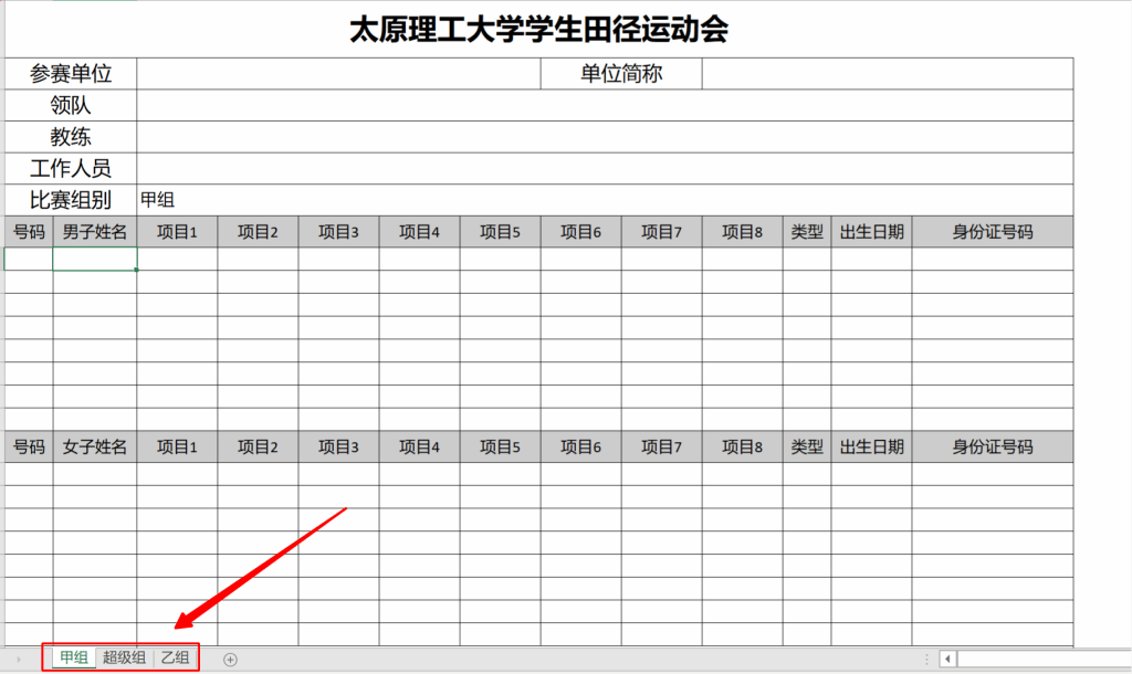 5、请不要添加列或修改报名表格式,否则无法正确导入!若运动员数量较多,可以插入行增加运动员报名数量。