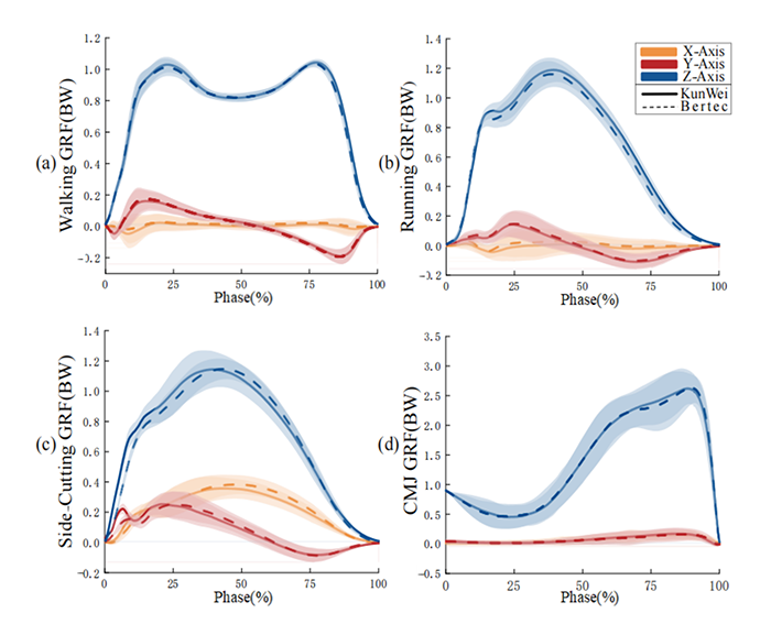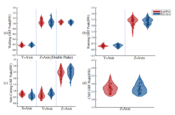 本研究旨在验证Kunwei三维测力台的可靠性与有效性。通过对15名男性老员工执行步行、跑步、纵跳和侧切四种动作,采用t检验、ICC和NRMSE评估Kunwei与Bertec设备的性能一致性。结果表明,Kunwei系统在峰值力测量上与Bertec系统无显著差异,ICC值超过0.98,RMSE低于0.165,显示出其高精确性和一致性。综上所述,Kunwei系统是一种经济高效的替代方案,适用于运动训练、康复及临床诊断等领域。
