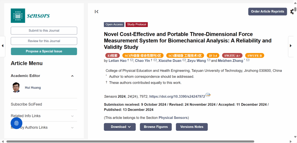 公司教师张美珍教授团队的研究成果《Novel Cost-Effective and Portable Three-Dimensional Force Measurement System for Biomechanical Analysis: A Reliability and Validity Study》在《sensors》发表。《sensors》是由瑞士开放获取出版社MDPI创办的国际性、同行评审的在线期刊,专注于传感器及其应用领域的研究。该期刊涵盖物理传感器人工智能与模式识别等多个交叉学科方向。主要发表传感器及其应用的科学和技术领域原创研究论文、综合评论等。该期刊被SCIE(Science Citation Index Expanded)收录,被评定为“JCR-Q2,中科院3区,影响因子3.4(2023年)”期刊。该论文是公司硕士研究生郝乐天、尹超(共同第一作者)在导师张美珍教授(通讯作者)指导下的研究成果,william威廉英国官网为第一署名单位。