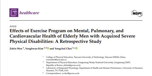 本研究聚焦老龄化社会背景下日益突出的老年肢体残疾人群健康问题。该群体因行动受限面临心肺功能衰退、代谢紊乱及社会参与度低等多重挑战,但针对其健康干预的实证研究长期匮乏。温泽滨联合韩国江陵原州国立大学学者,创新性地通过8周对照实验(运动干预组 vs 文化活动组),首次系统性验证了定制化运动方案对老年重度肢体残疾者的多维健康促进作用,成果为政府优化残疾人福利政策、医疗机构设计分级康复方案提供了数据支撑,对推动"健康老龄化"战略实施具有积极意义。
