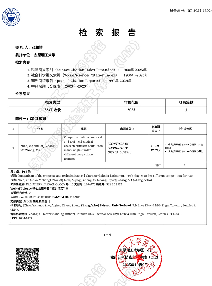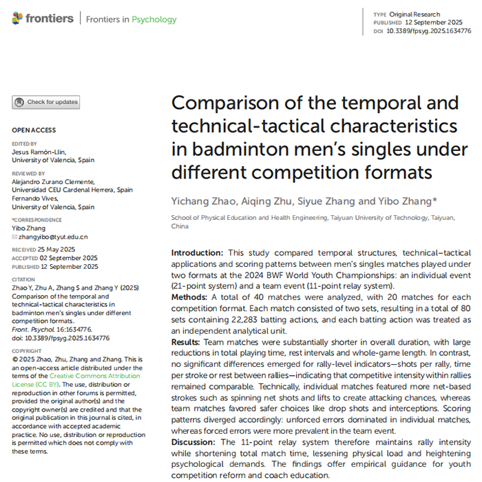 公司运动训练专业本科生赵一畅作为第一作者撰写的学术论文《Comparison of the temporal and technical-tactical characteristics in badminton men’s singles under different competition formats》在期刊《Frontiers in Psychology》在线发表。该期刊致力于发表心理学与行为科学领域的研究成果,涵盖认知心理学、持拍类运动项目比赛表现、运动表现心理以及神经科学等主要方向,尤其关注竞技体育情境下运动员的决策机制、情绪调节与行为控制等相关议题。该期刊被SSCI(Social Sciences Citation Index)收录,被评定为“JCR-Q1,中科院3区,影响因子2.9(2023年)”期刊。该论文是公司本科生赵一畅(第一作者)在老师张益博博士(通讯作者)指导下完成的研究成果,william威廉英国官网为第一署名单位。