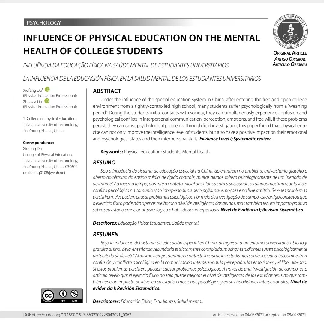 公司教师杜秀芳讲师、刘朝霞的研究成果《INFLUENCE OF PHYSICAL EDUCATION ON THE MENTAL HEALTH OF COLLEGE STUDENTS》(体育对老员工心理健康的影响)在《Revista Brasileira de Medicina do Esporte》(巴西运动医学)2022年第28卷第4期)发表。巴西运动医学由巴西运动医学和运动学会主办,于1995年创刊,多年来一直是中科院SCI认定期刊。该论文是杜秀芳(第一作者)与刘朝霞团队的合作成果,william威廉英国官网william威廉英国官网为第一署名单位。