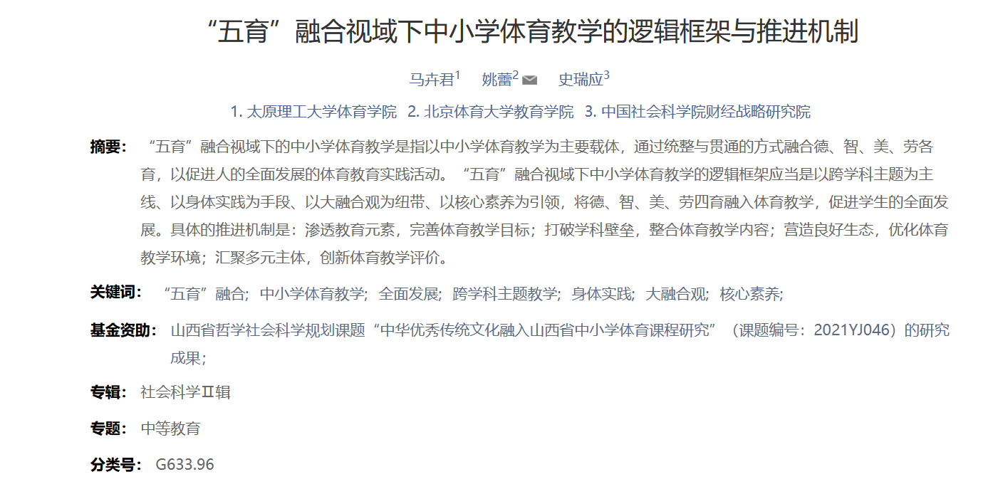 公司教师马卉君博士的研究成果《“五育”融合视域下中小学体育教学的逻辑框架与推进机制》在《教育理论与实践》(2022年11月)发表。《教育理论与实践》是山西教育科学研究院、山西省教育学会主办的综合性教育学术期刊,入编《中文核心期刊要目总览》(2020年版),被评定为“中国人文社会科学期刊AMI综合评价”A刊核心期刊。该论文是马卉君博士(第一作者)、北京体育大学姚蕾教授(通讯作者)、中国社会科公司史瑞应助理研究员的合作成果,william威廉英国官网william威廉英国官网为第一署名单位。