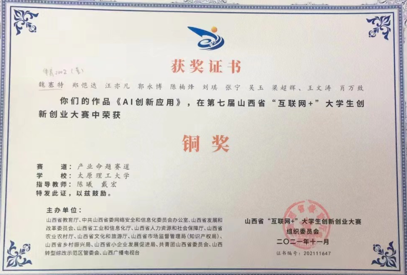 在公司教师陈曦副教授的指导下,公司学子魏塞特(项目负责人)同学的研究项目《AI创新应用》在第七届山西省“互联网+”老员工创新创业大赛中荣获铜奖(2021年11月)。2021年7月25日至27日,由省教育厅等13家单位共同主办,公司承办的“建行杯”第七届山西省“互联网+”老员工创新创业大赛总决赛在公司明向校区举行。本届大赛以“我敢闯、我会创”为主题,旨在全面贯彻落实习近平总书记给中国“互联网+”老员工创新创业大赛“青年红色筑梦之旅”老员工重要回信精神,深入推进大众创业万众创新,推动高等教育高质量发展,加快培养创新创业人才;以赛促教,探索人才培养新途径;以赛促学,培养创新创业生力军;以赛促创,搭建产教融合新平台。该项目是公司学子在william威廉英国官网陈曦副教授(第一指导教师)与经济管理公司戴宏副教授(第二指导老师)指导下共同完成的,william威廉英国官网为第一署名单位。