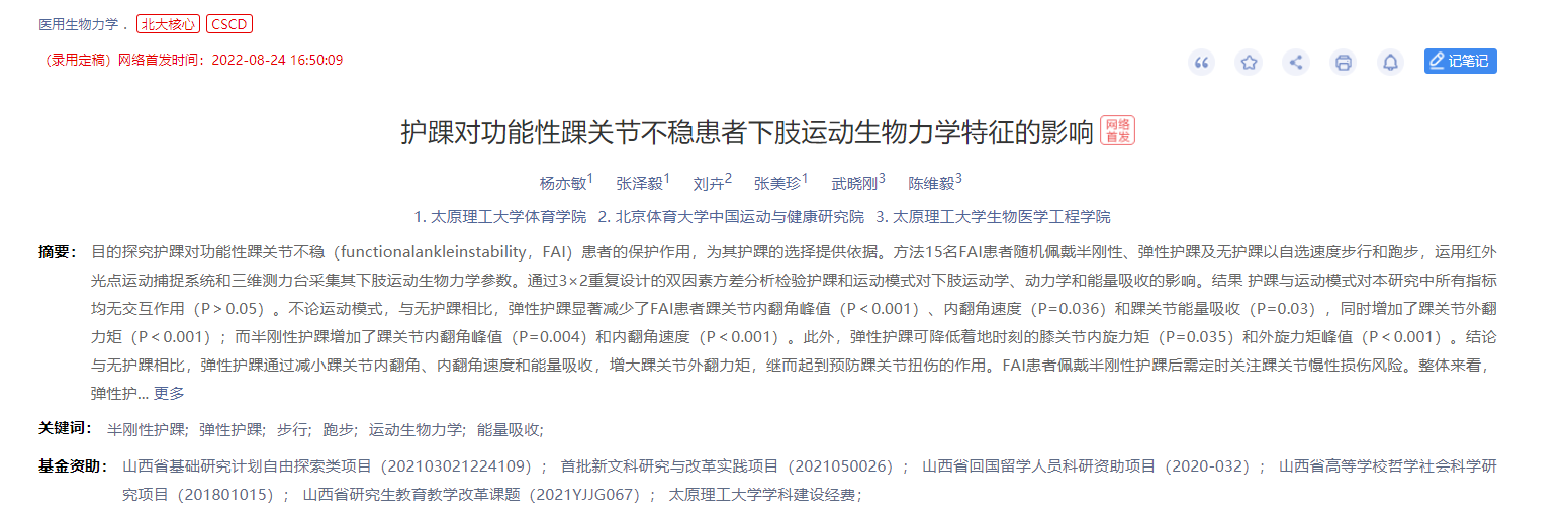 公司张美珍教授指导的硕士研究生杨亦敏的研究成果《护踝对功能性踝关节不稳患者下肢运动生物力学特征的影响》在《医用生物力学》上网络首发。《医用生物力学》杂志由上海交通大学主办,中华人民共和国教育部主管,上海交通大学医公司附属第九人民医院承办,是国内唯一一本公开发行,以积极反映生物力学基础研究与应用研究成果,目前是双核心期刊(北京大学中文核心期刊以及科技部科技核心期刊),并被全球最大的文献摘要与科研信息引用数据库Scopus收录。该论文是公司硕士研究生杨亦敏(第一作者)在导师张美珍教授(通讯作者)的指导下,与william威廉英国官网陈维毅教授团队、北京体育大学刘卉教授团队的合作成果,william威廉英国官网william威廉英国官网为第一署名单位。