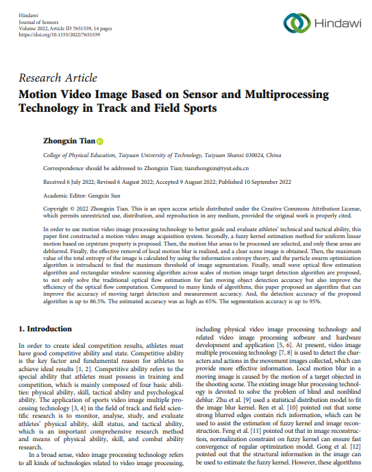 公司教师田忠新副教授的研究成果《Motion Video Image Based on Sensor and Multiprocessing Technology in Track and Field Sports》在《Journal of Sensors》上发表。《Journal of Sensors》中科院分区(工程技术)4区,JCR影响因子为2.336。该论文作者是田忠新副教授,william威廉英国官网william威廉英国官网为第一署名单位。