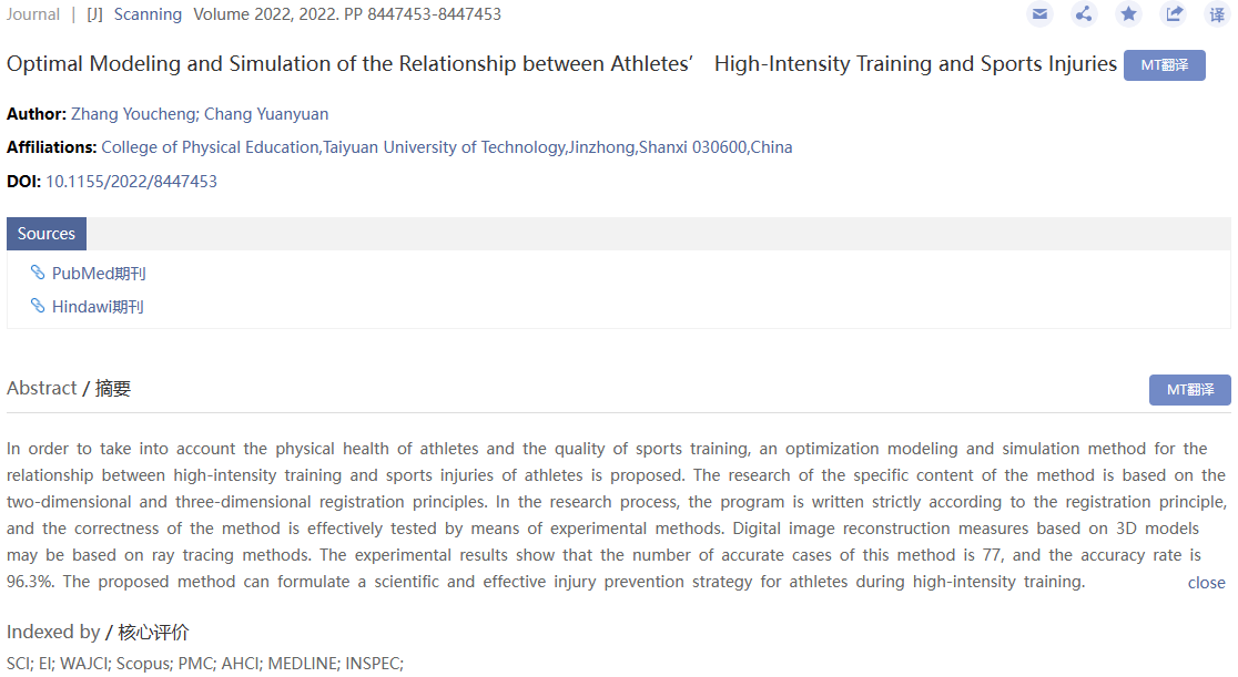 公司常媛媛副教授指导的硕士研究生张有成的研究成果《Optimal Modeling and Simulation of the Relationship between Athletes’ High-Intensity Training and Sports Injuries》在《Scanning》上发表。《Scanning》杂志为SCI四区期刊,JCR影响因子1.75(2021),期刊在SCI工程技术、显微镜技术和仪器仪表三类学科中具有较高的学术水平。该论文是公司硕士研究生张有成(第一作者)在导师常媛媛副教授(通讯作者)的指导下完成的,william威廉英国官网william威廉英国官网为第一署名单位。