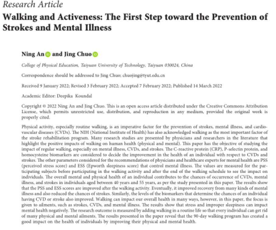 公司教师安宁、啜静研究成果《Walking and Activeness: The First Step toward the Prevention of Strokes and Mental Illness》在《Computational Intelligence and Neuroscience》(2022年3月)发表。该刊致力于发表经过严格同行评审的高质量原创文章,反映计算智能和神经科学与跨学科融合领域的新进展、新技术、新成果,促进学科交叉与融合领域科研交流和科研成果转化,中科院分区四区,JCR影响因子3.633(2020)。该论文是安宁(第一作者)与啜静(通讯作者)以及山西医科大学第一医院老年病科的合作成果,william威廉英国官网william威廉英国官网为第一署名单位。