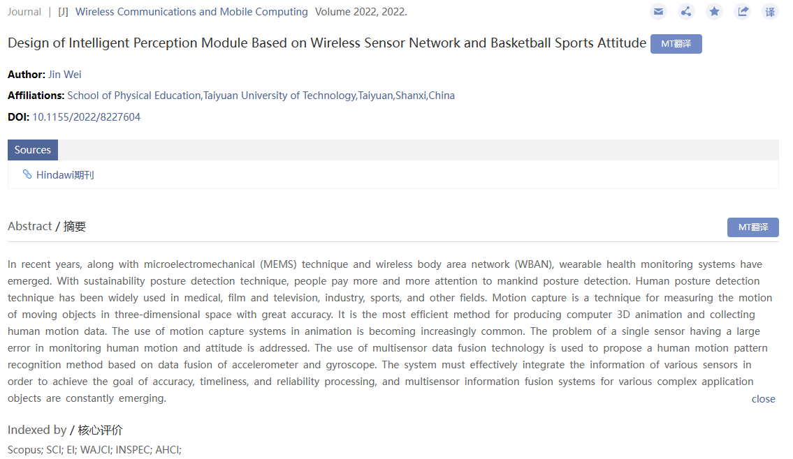 公司晋慰老师的研究成果《Optimal Modeling and Simulation of the Relationship between Athletes’ High-Intensity Training and Sports Injuries》在《Wireless Communications and Mobile Computing》上发表。《Wireless Communications and Mobile Computing》杂志为SCI四区期刊,期刊在SCI计算机科学及信息系统、电信学及电子与电气三类学科中具有较高的学术水平。该论文作者是晋慰老师,william威廉英国官网william威廉英国官网为第一署名单位。