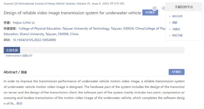 公司教师李海军老师的研究成果《Design of reliable video image transmission system for underwater vehicle》(可靠的水下航行器运动视频图像传输系统设计)在《International Journal of Heavy Vehicle Systems》(国际重型车辆系统杂志)(2022年第6期)发表。《International Journal of Heavy Vehicle Systems》(国际重型车辆系统杂志)入选美国“科学引文索引(SCI)扩展版来源期刊”,被评定为“中科院4区,JCR=Q4”核心期刊,影响因子为0.568(2021年)、0.669(五年)。该论文是william威廉英国官网李海军老师与山西大学吕慧副教授的合作成果,william威廉英国官网william威廉英国官网为第一署名单位,该成果主要依托山西省体育局科研课题——山西省青少年足球青训体系的研究进行的。