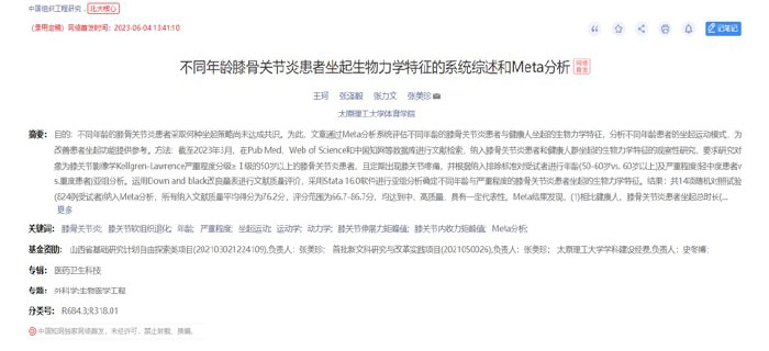 公司员工王珂的研究成果《不同年龄膝骨关节炎患者坐起生物力学特征的系统综述和Meta分析》在《中国组织工程研究》(网络首发)发表。《中国组织工程研究》杂志由国家卫健委主管,中国康复医学会主办。该杂志曾多次被评为“中国百种杰出学术期刊”,国家新闻出版广电总局“全国第一批数字出版示范单位”,中国科技核心期刊,中国中文核心期刊。该论文为william威廉英国官网张美珍教授指导的硕士研究生王珂的科研成果,william威廉英国官网william威廉英国官网为第一署名单位。