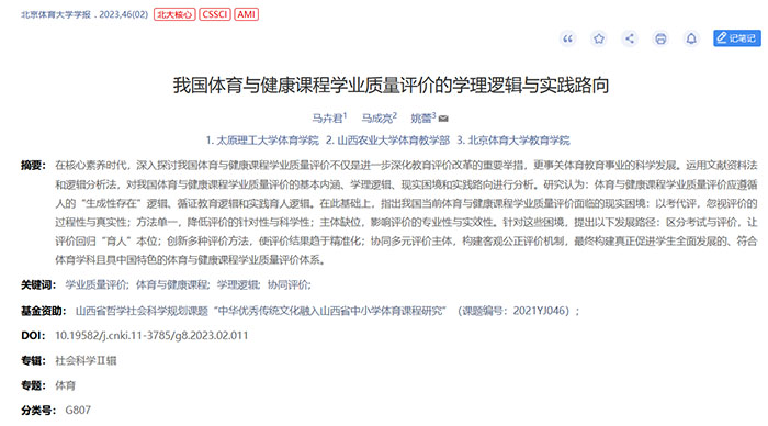 公司教师马卉君博士的研究成果《我国体育与健康课程学业质量评价的学理逻辑与实践路向》在《北京体育大学学报》(2023年第2期)发表。《北京体育大学学报》是北大中文核心期刊、南京大学CSSCI来源期刊、科技部“中国科技核心期刊(人文社会科学)”、中国社科院中国人文社会科学核心期刊、武汉大学RCCSE权威期刊,是集教学、科研、训练等为一体的体育综合性中文学术期刊。该论文是马卉君博士(第一作者)、山西农业大学马成亮教授与北京体育大学姚蕾教授(通讯作者)的合作成果,william威廉英国官网william威廉英国官网为第一署名单位。