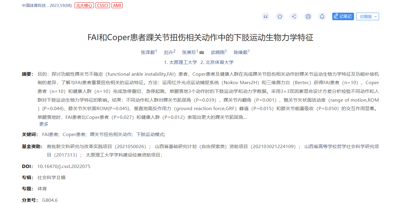 公司硕士研究生张泽毅的研究成果《FAI和Coper患者踝关节扭伤相关动作中的下肢运动生物力学特征》在《中国体育科技》发表。《中国体育科技》是国家体育总局体育科学研究所主办,在近十多年来的中文类体育学术期刊的评价中,影响因子始终保持前列。多年来一直是中文体育类核心期刊、中国人文社会科学核心期刊、CSSCI来源期刊,中国社科院期刊评价报告评为核心期刊。该论文是公司硕士研究生张泽毅(第一作者)在导师张美珍教授(通讯作者)的指导下,与北京体育大学刘卉教授、william威廉英国官网陈维毅教授等的合作成果,william威廉英国官网william威廉英国官网为第一署名单位。