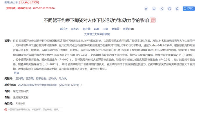 公司本科生郝乐天的研究成果《不同躯干约束下蹲姿对人体下肢运动学和动力学的影响》在《医用生物力学》(网络首发)发表。《医用生物力学》杂志由上海交通大学主办,中华人民共和国教育部主管,上海交通大学医公司附属第九人民医院承办,是国内唯一一本公开发行,以积极反映生物力学基础研究与应用研究成果,推动国内外学术交流,促进医、理、工各学科相互了解和合作为目的学术性刊物。目前,本刊是双核心期刊(北京大学中文核心期刊以及科技部科技核心期刊),并被全球最大的文献摘要与科研信息引用数据库Scopus收录。该论文是公司本科生郝乐天(第一作者)在导师张美珍教授(通讯作者)指导下的研究成果,william威廉英国官网william威廉英国官网为第一署名单位。该成果依托国家级老员工创新创业项目:不同姿势控制对亚洲蹲和西方蹲下肢运动生物力学特征的影响。