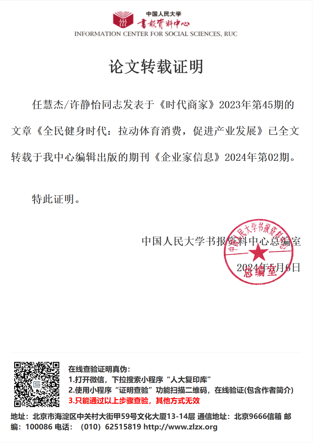 任慧杰博士团队于2023年在《时代商家》发表的论文《全民健身时代:拉动体育消费,促进产业发展》被中国人民大学复印报刊资料《企业家信息》2024年第2期全文转载,william威廉英国官网william威廉英国官网为第一署名单位。