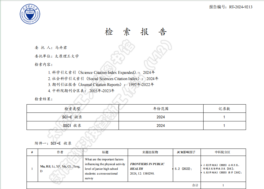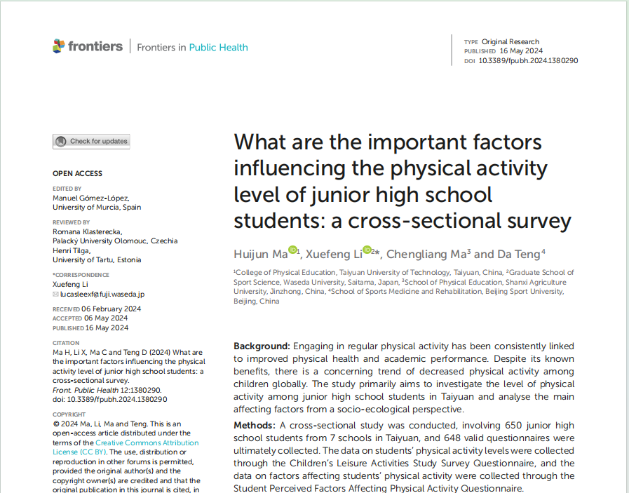 公司教师马卉君的研究成果《What are the important factors influencing the physical activity level of junior high school students: a cross-sectional survey》在《Frontiers in Public Health》发表。《Frontiers in Public Health》涵盖公共卫生方向的不同研究领域,旨在向全球研究人员、学者、临床医生、政策制定者和公众传播和交流科学知识和有影响力的发现的最前沿。该期刊同时被SCIE(Science Citation Index Expanded)和SSCI(Social Science Citation Index)双数据库收录,被评定为“JCR-Q2,中科院3区”期刊。该论文是马卉君博士(第一作者)、日本早稻田大学李雪峰博士(通讯作者)、山西农业大学马成亮教授、北京体育大学滕达的合作成果,william威廉英国官网william威廉英国官网为第一署名单位。
