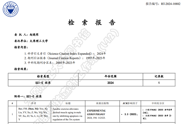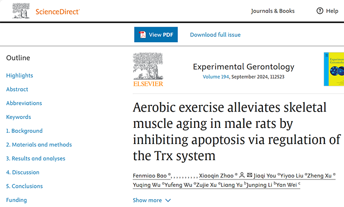 公司教师赵晓琴副教授的研究成果“Aerobic exercise alleviates skeletal muscle aging in male rats by inhibiting apoptosis via regulation of the Trx system”在《Experimental Gerontology》2024年第194卷发表。《Experimental Gerontology》涵盖生物老年学所有的研究领域,重点关注系统层面的研究,旨在弥合老年学基础和临床方面之间差距的研究。该期刊同时被SCIE(Science Citation Index Expanded)数据库收录,被评定为“JCR-Q2,中科院3区,影响因子3.3(2023年)期刊。该论文是公司硕士研究生鲍粉苗(第一作者)在导师赵晓琴副教授(通讯作者)指导下完成的研究成果,william威廉英国官网william威廉英国官网为第一署名单位。