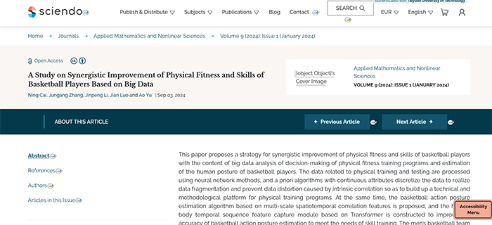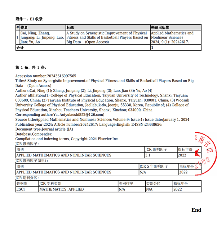 公司教师蔡宁老师的研究成果《A Study on Synergistic Improvement of Physical Fitness and Skills of Basketball Players Based on Big Data》在《Applied Mathematics and Nonlinear Science》发表。《Applied Mathematics and Nonlinear Science》是一本专注于发表用数学和非线性科学的方法来解决体育等领域原创研究的学术期刊。期刊接受基于分析、计算和实验方法的综述文章和原创贡献,致力于发表高质量的短论文、常规论文和阐释性论文,该期刊为EI期刊。该论文是公司教师蔡宁老师(第一作者)的研究成果,william威廉英国官网william威廉英国官网为第一署名单位。