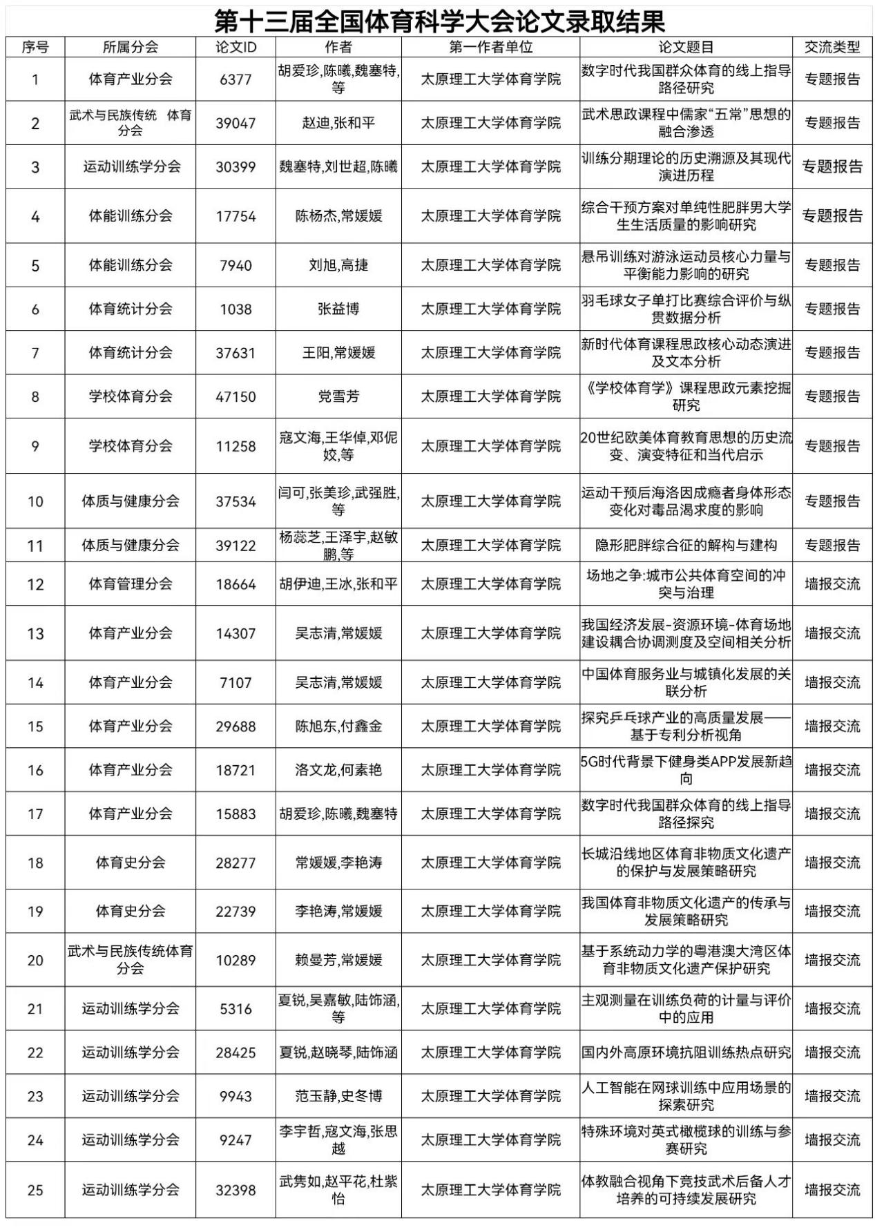 公司在本次会议中录用论文涉及公司体育、运动训练学、运动生物力学、体质与健康、体育社会科学、体育管理、体育统计、体育产业、运动心理、体能训练、武术与民族传统体育、运动营养12个分会板块,参会形式主要分为专题报告、墙报交流及书面交流。其中,专题报告录取11篇,墙报交流35篇,书面交流17篇。参加全国体育科学大会不仅仅是与同行进行学术的交流,更是思想的碰撞,亦是提高公司辨识度的一个很好的平台。未来,我们还将继续在国际和国内会议中加强学术交流。