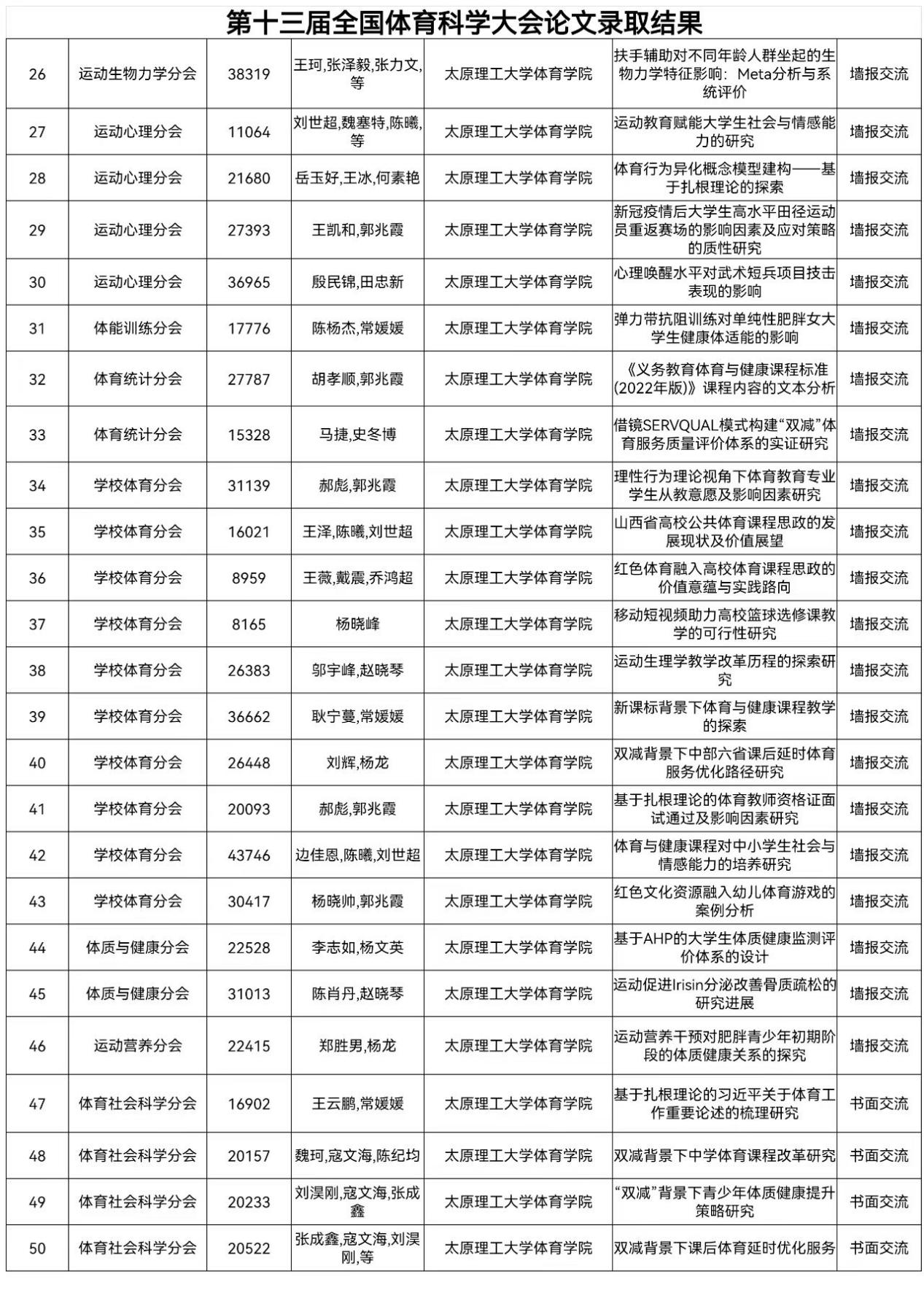 2023年8月31日,中国体育科学学会公布了第十三届全国体育科学大会论文录取结果,william威廉英国官网63篇论文入围,创历史最佳成绩。全国体育科学大会是由中国体育科学学会主办的国内最具权威性和影响力、最大规模和最高层次的综合性体育学术会议,是全国体育科技工作者展示最新体育科研成果、科技成果和交流科技信息的盛会。在国家体育总局、中国科协的大力支持和全国广大体育科技工作者的积极参与下,全国体育科学大会已成为享誉中外的体育学术交流品牌活动。